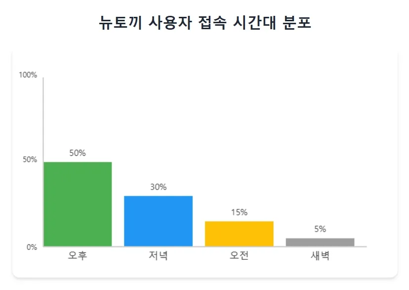 이 그래프는 2024년 뉴토끼 사용자 접속 시간대를 보여줍니다. 오후 시간이 50%로 가장 활발하며, 저녁과 오전이 뒤를 이어요. 출퇴근 시간에 웹툰이 인기 많아요!