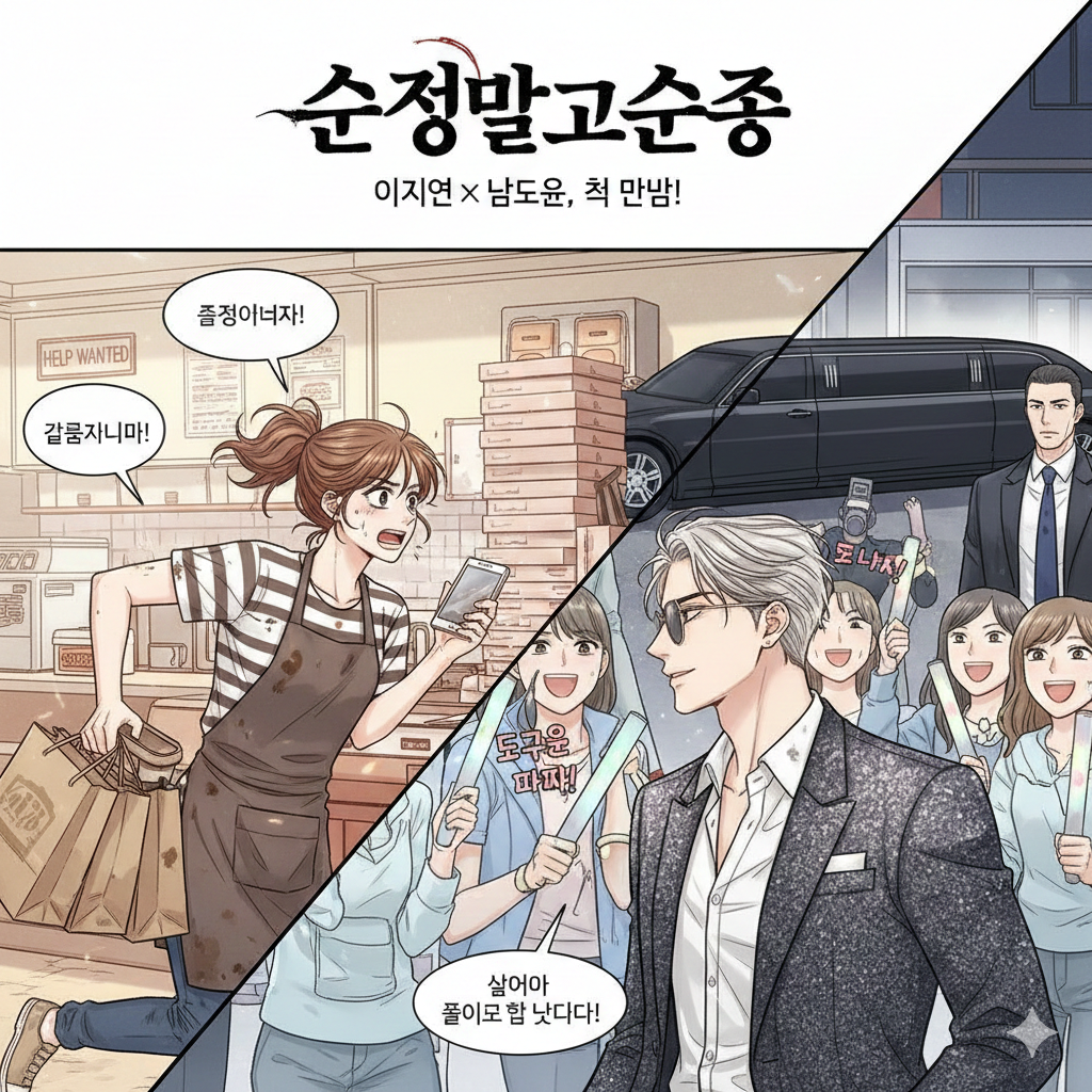 웹툰 <순정 말고 순종>은 평범한 25세 알바생과 톱 배우 사이의 특별한 인연을 중심으로 전개되는 로맨스 작품입니다. 주인공 이지언은 하루에 여러 아르바이트를 뛰며 고단한 삶을 살아가는 청년으로, 직장 생활과 현실의 벽에 부딪히며 하루하루를 버텨나갑니다. 그러던 중 우연한 사건을 통해 대한민국 최고의 인기 배우 남도윤과 엮이게 되고, **’밈지’**라는 인형으로 그를 조종할 수 있게 되는 초현실적인 상황을 맞이하게 됩니다.